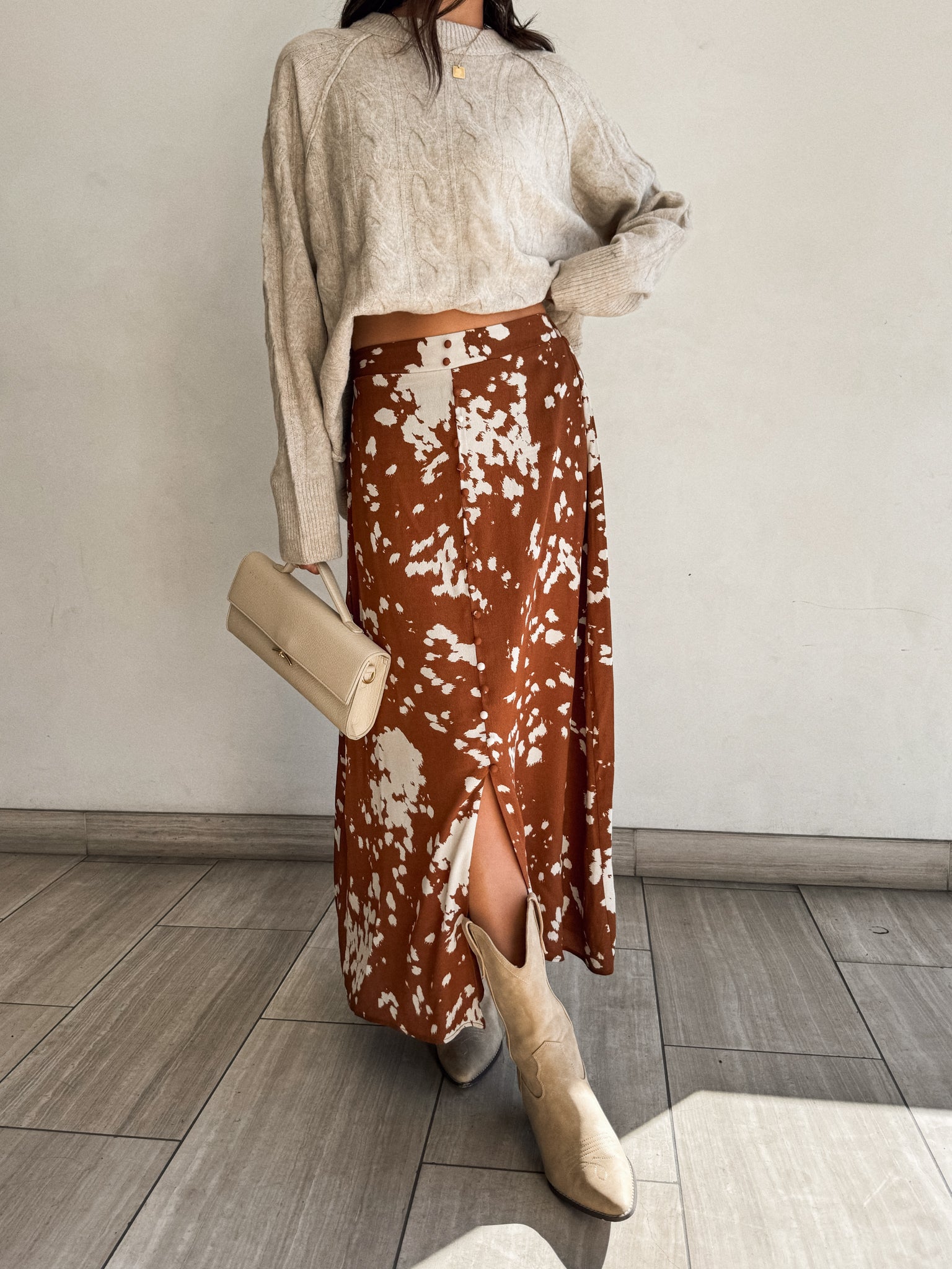 Feast your eyes on our NEW Pecan Pie Midi Skirt! This gorgeous new style features a warm. rust color with white speckled detail. Style this skirt with a cream cable knit sweater and suede boots for this year’s Thanksgiving! Accessorize with gold jewelry and you’re all set!