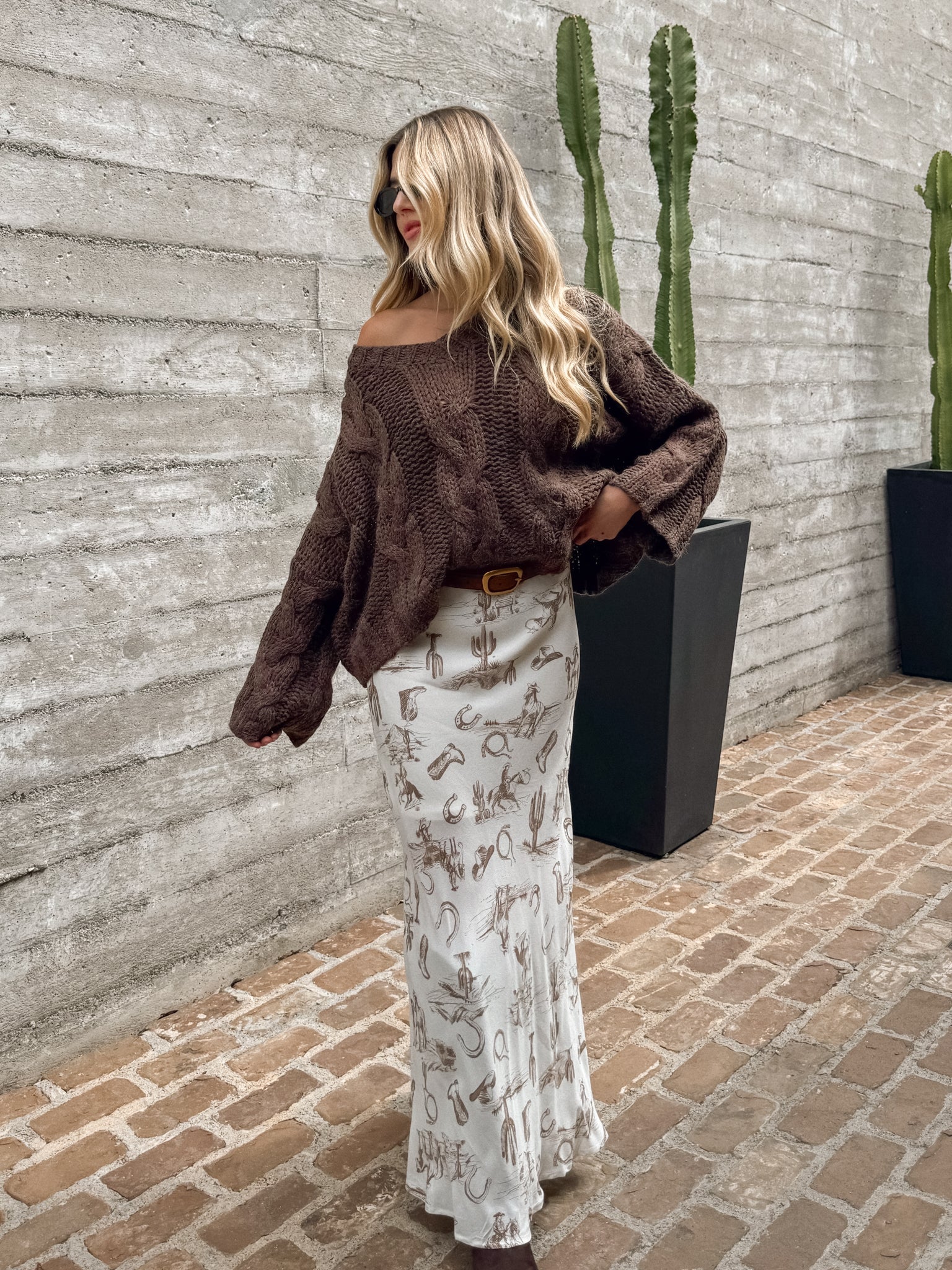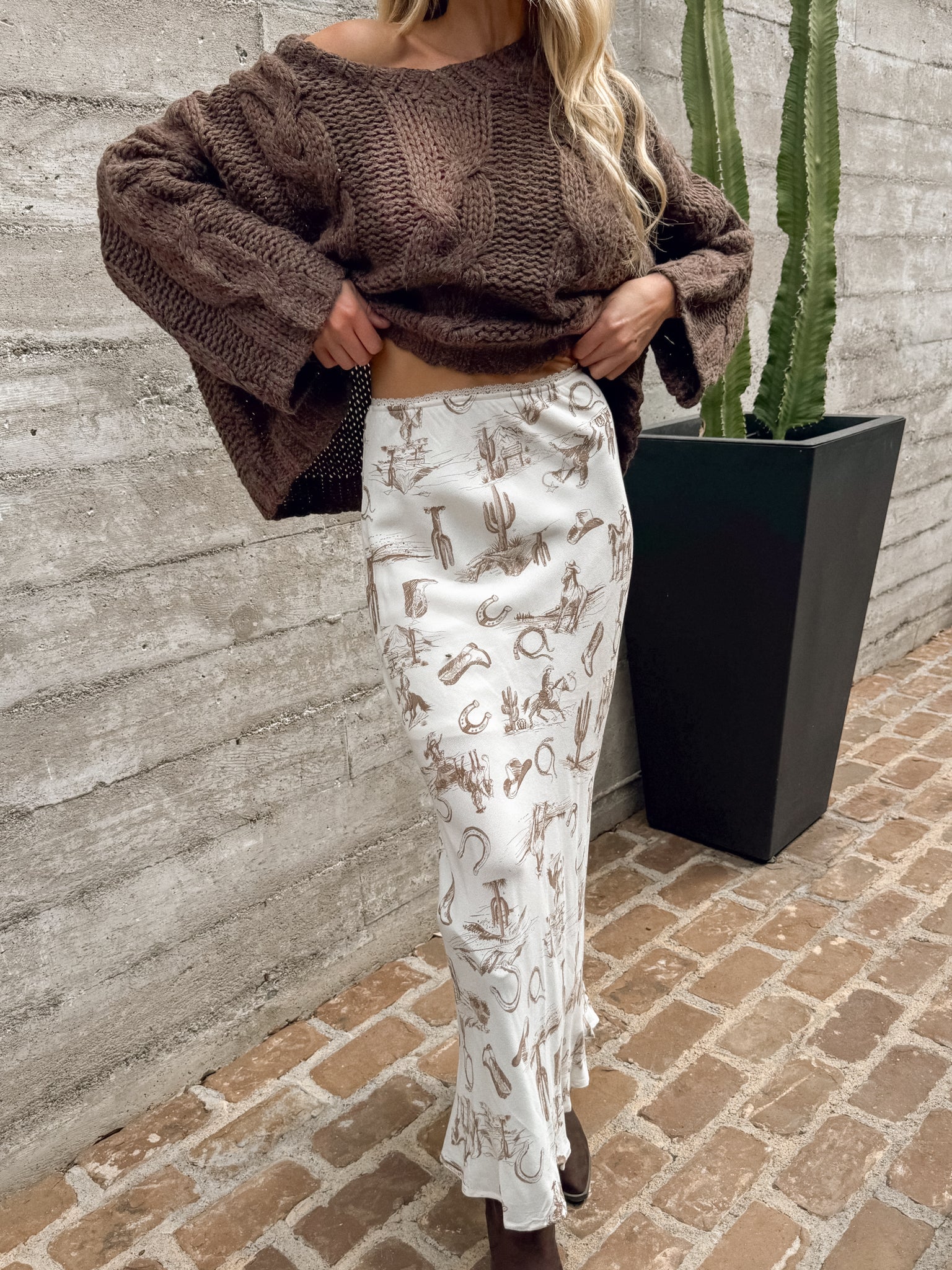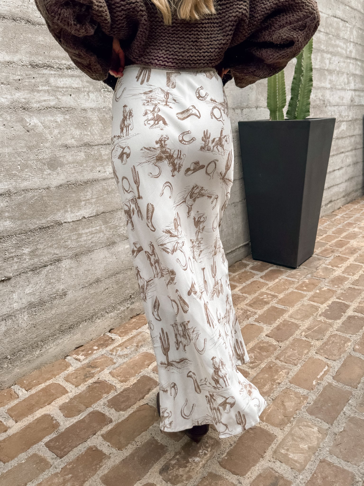 We just can’t get enough of western print. Meet our NEWEST fall obsession! Style our Rancho Western Maxi Skirt with a white mini tee and brown cowboy boots for an effortless casual chic look! Accessorize with gold jewelry and a vegan suede bag to complete the look.